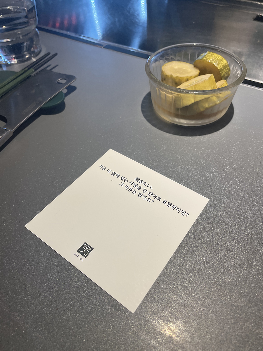 옆에 있는 사람을 한 단어로 표현한다면? 테이블 마다 요런 카드가 놓여있구나. 이걸 밖에 붙여 놓는구만.