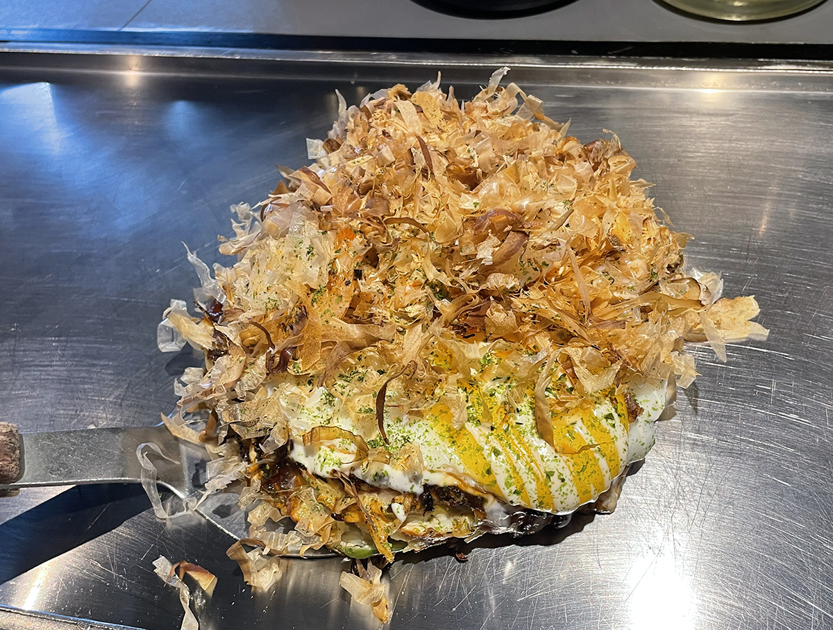 곧이어 나온 네기오코노미야끼. 기본 메뉴인듯 하다. 반숙 계란 후라이와 통통한 새우가 올라가있는, 가쓰오부시가 춤을 추는 오코노미야끼다. 다른 메뉴들도 다 맛있을듯.
