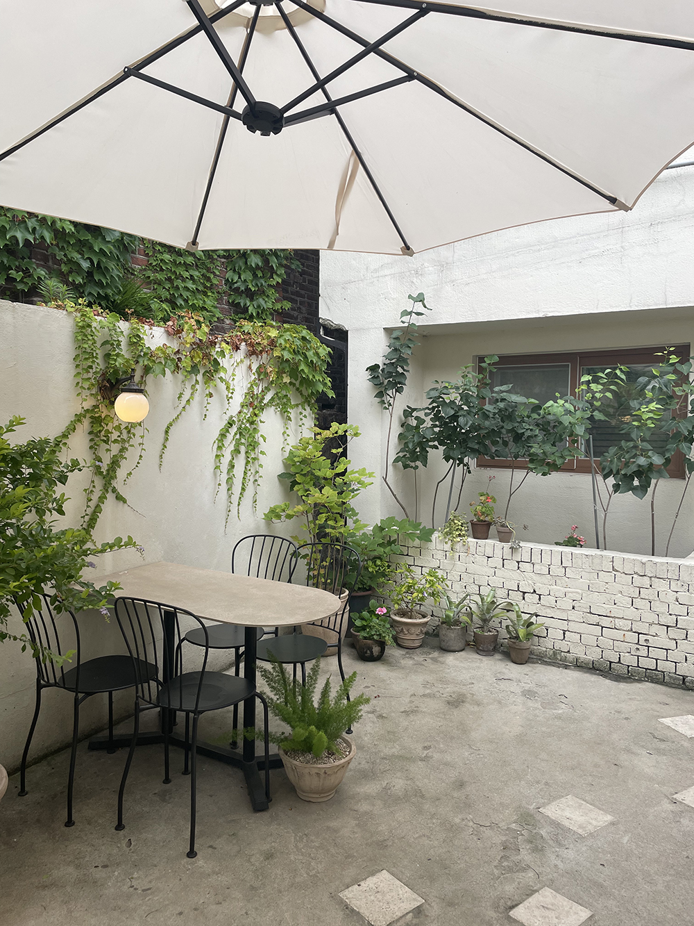 카운터 뒷쪽 문으로 들어가면 나오는 자리. 외부라 더움에도 불구하고 손님이 사용하고 있었다. 요기 공간은 정말 조용히 이야기 하기 좋아보인다.