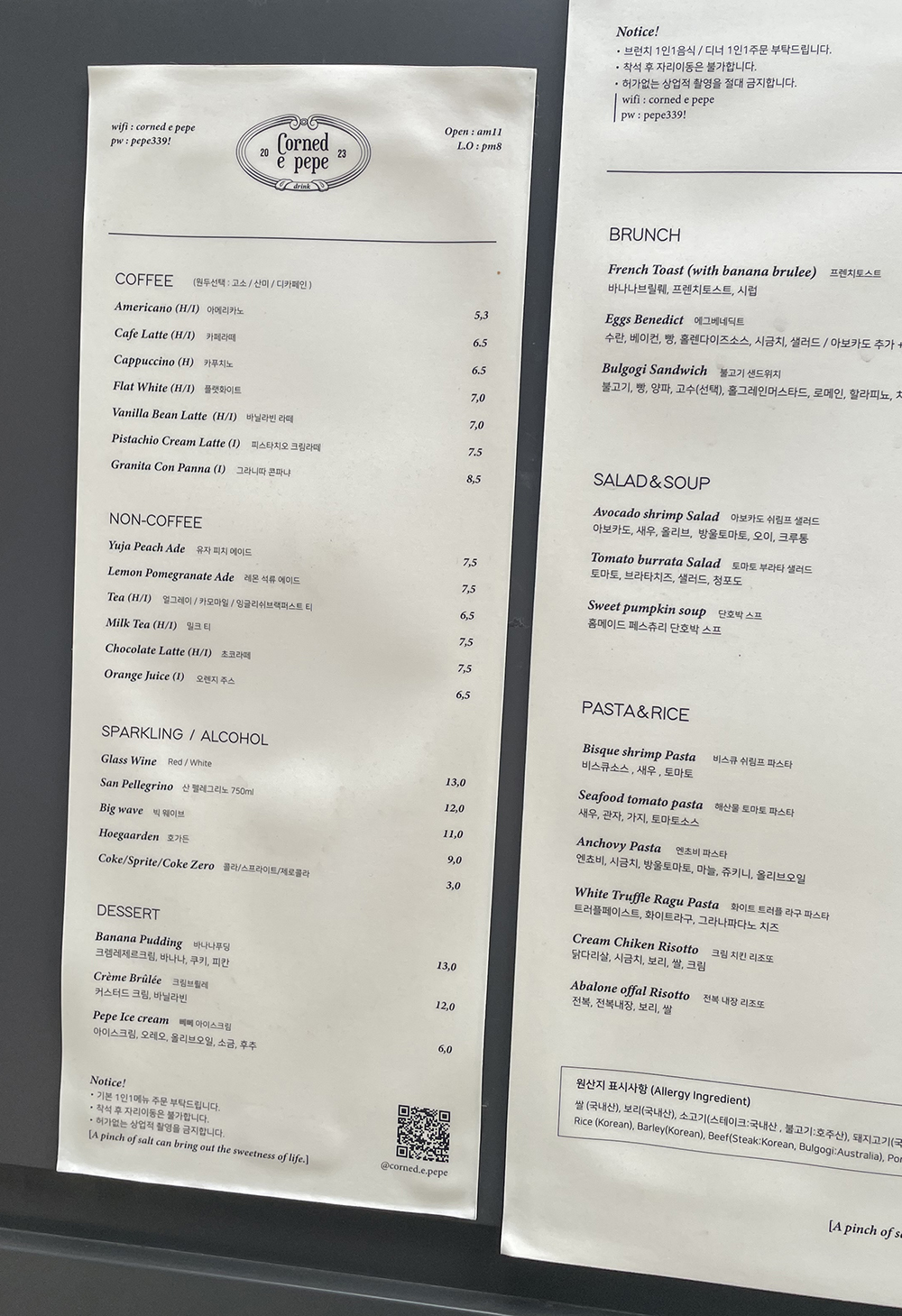 한국사람들 입맛에 딱맞는 파스타인거 같다. 살짝 칼칼하면서도 해물의 감칠맛이 진하게 모든 재료들을 어우러지게 만드는 듯. 파스타면과 들어간 소스, 다른 토핑들이 따로 노는 파스타도 많이 먹어봤는데, 여긴 정말 고루고루 튀는 것 없이 협력해서 맛을 만들어내는 기분이었다.